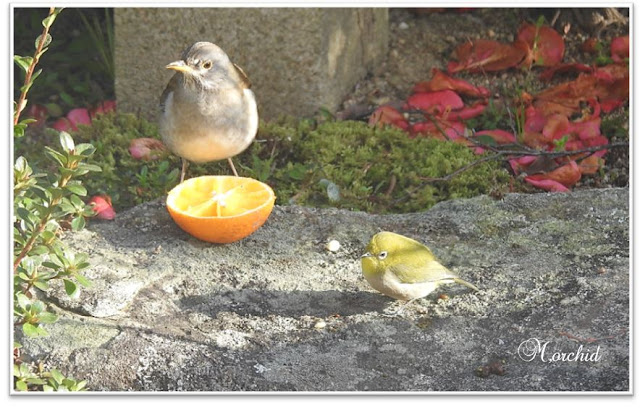 It’s so sweet of her to make those masks for children. She is very skilled indeed! I bet her cute masks cheer up children especially during this difficult time. I hope all your friends and family stay safe. Adorable birdies. The photo of Pale Thrush and Japanese White Eye together especially is very cute :-) A blue bird (I think woodpecker) came to our feeder when Goro and I were on deck. The bird was rather large and Goro got very excited :-)